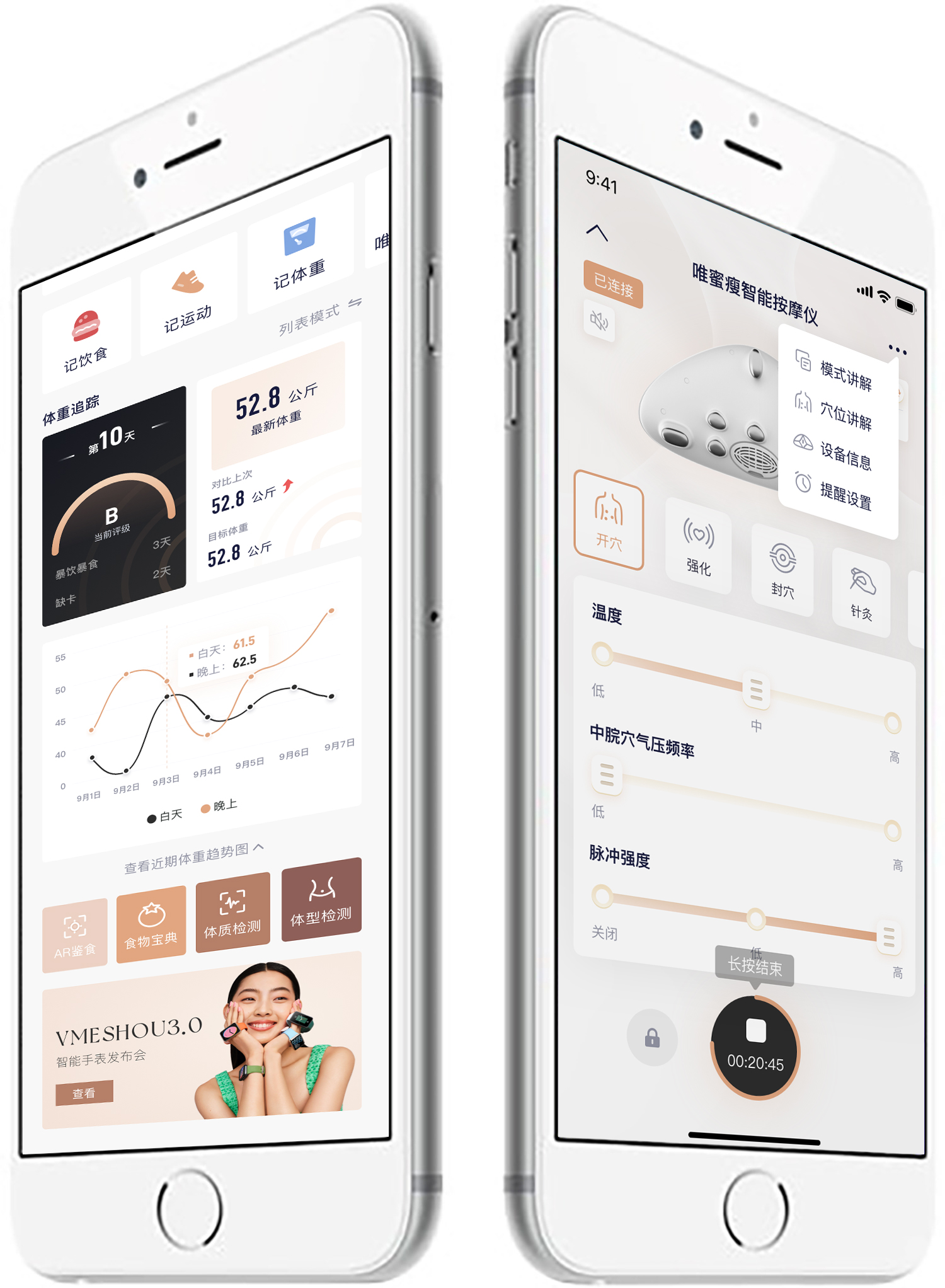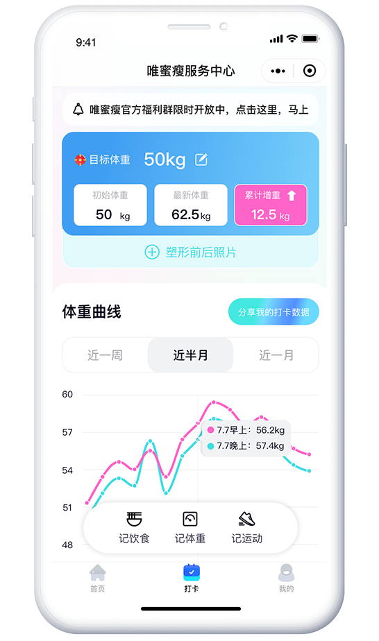 VMESHOU唯蜜瘦服务中心小程序,可提供顾客记录早晚体重、数据趋势图、BMI指数、体脂率等指标,并支持365天在线客服咨询服务。
